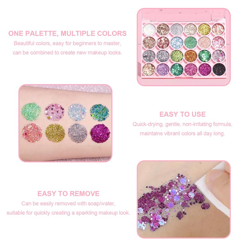 - 【Usage& Occasions】24 different Colorful Glitter Eyeshadow Palette, ideal for Party, Cosmetic Show, Live Show, Prom Night, Dance Party, and Wedding Makeup. With unique package, would be the perfect gift to your friends, bestie, families.