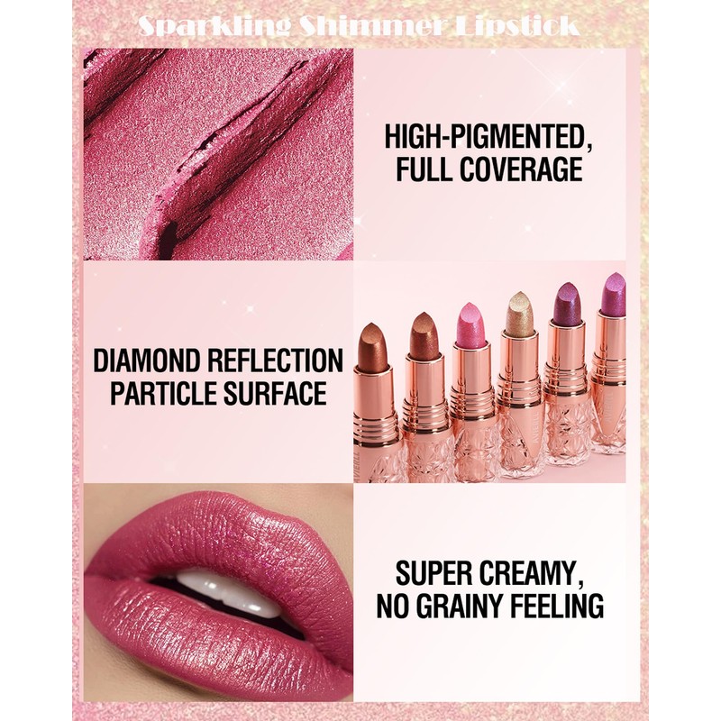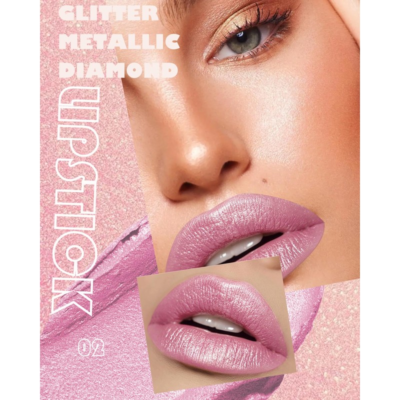 - Glitter Metallic Lipstick - Experience the magic of Metallic Shine Lipstick, which is packed with intensive shimmering powders that sparkle with a diamond-like sheen, leaving your lips shiny, waterproof and moisturized all day long. It comes in 6 bold and vibrant colors, each with a diamond shimmer that creates a dazzling, shimmering effect with every application, to suit your makeup needs for any occasion. Apply lightly for a subtle, glossy lip look, or apply thickly for a metallic shine.