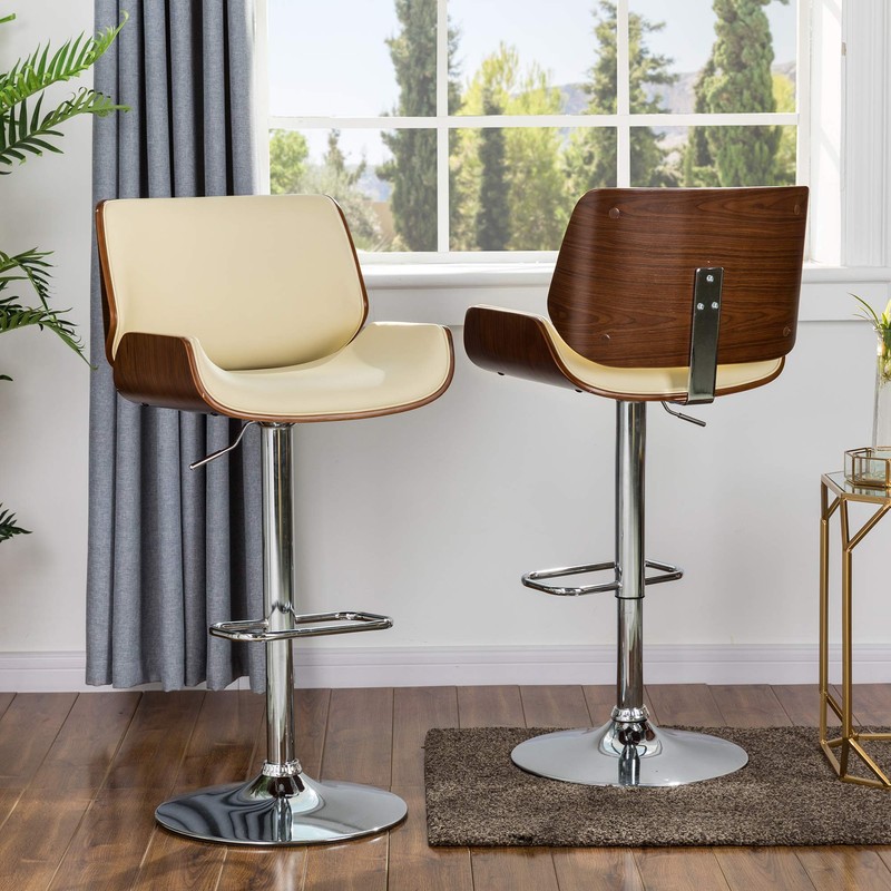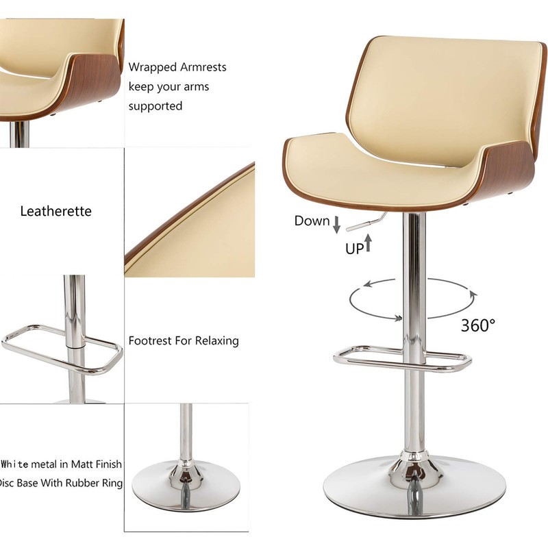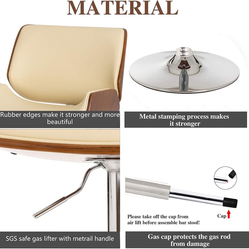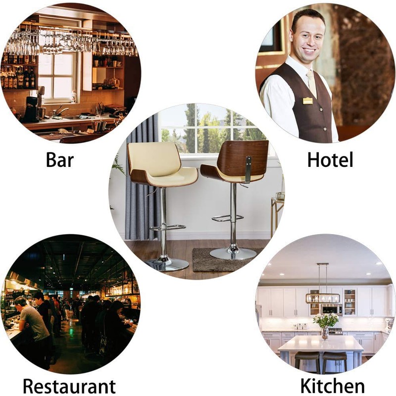 - 【Retro Design with Comfortable Footrest】----- Matte beige PU leather with strong metal black matte base and footrest and Made of bent plywood frame with walnut veneer. Whether placed in living room, kitchen, study or pub, the bar stools of retro design will go well with other furniture and satisfy you. Rounded footrest with appropriate height will carry some of your body weight to seat and gives your feet a comfortable rest.