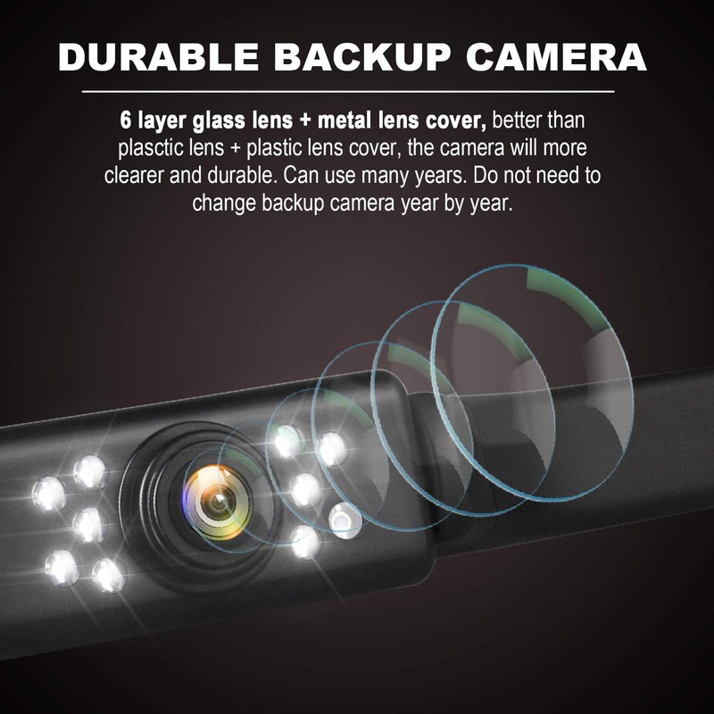 - Super HD Day& Night Vision: Our HD Reverse Camera with new upgrade chips and glass lens, supply you HD true color, real time image at day and night. 9 Led lights will be Auto turn off in bright light areas