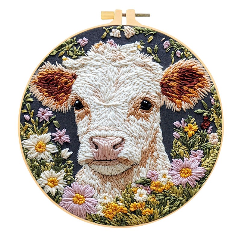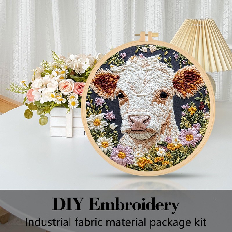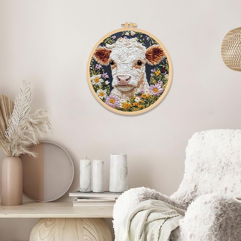 GLLBTPT Embroidery Kit for Adults Beginner – Cartoon Cow with Daisy Flower DIY Embroidery Set, Includes Printed Cloth, Cotton Thread Pack, Frame & Instructions
