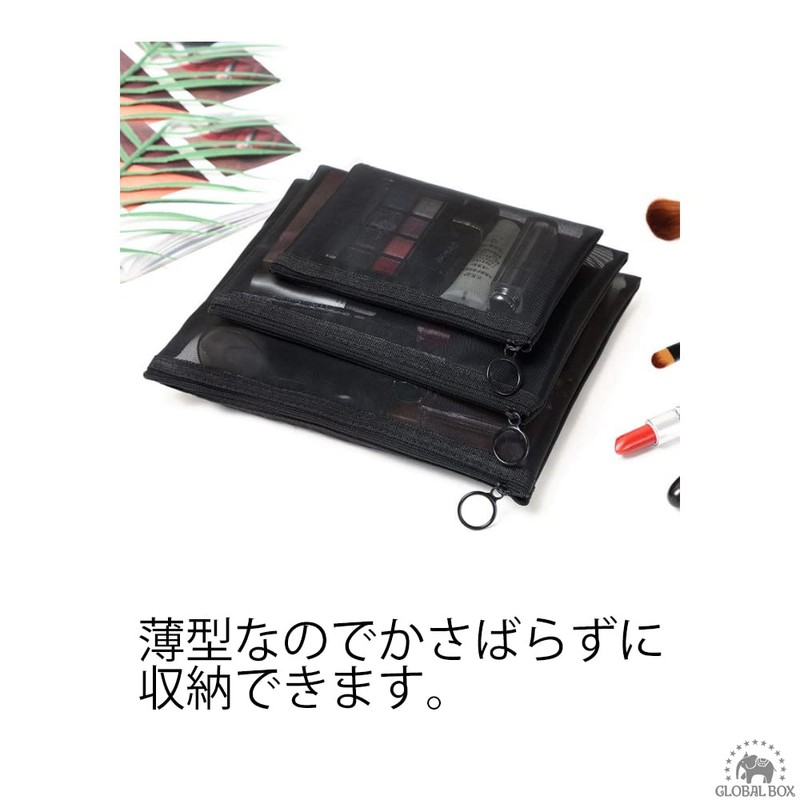 GLOBAL BOX Mesh Pouch, Black, Travel Cosmetic Pouch, Large, Medium, Small, Set of 3