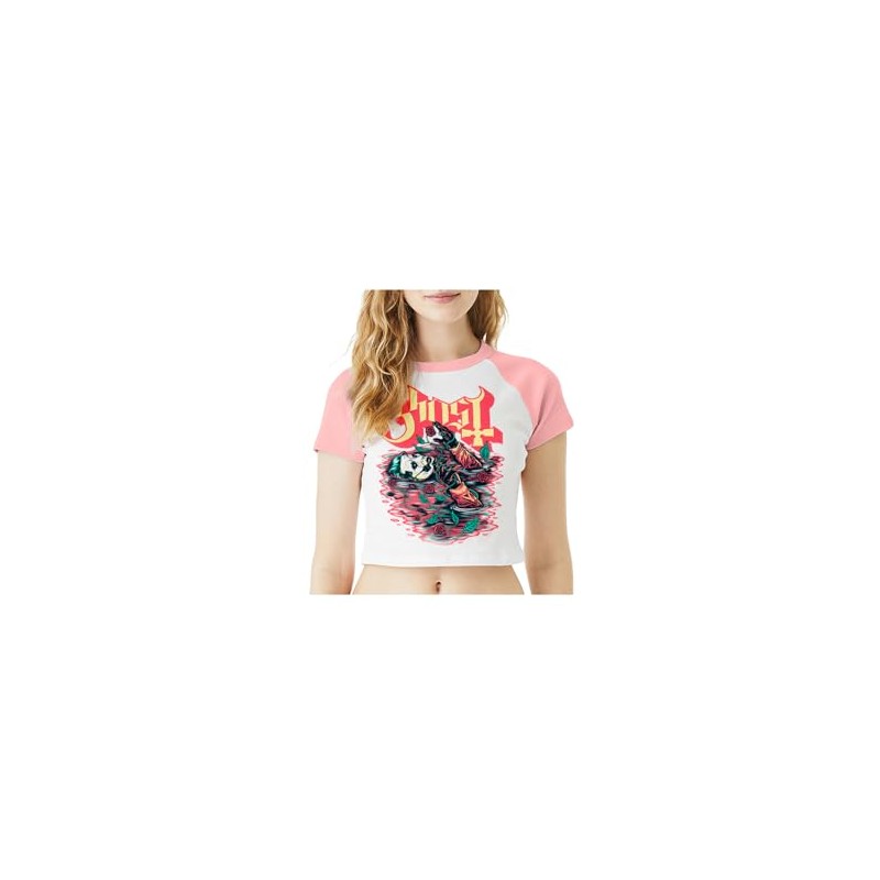 - Ghost Pre-Raphaelite Papa Roses Pink Short Sleeve Micro Raglan Tee boasts a captivating blend of artistry and mystique, featuring the beloved Papa IV amidst intricate pink roses, embodying the essence of the band in a chic and feminine design