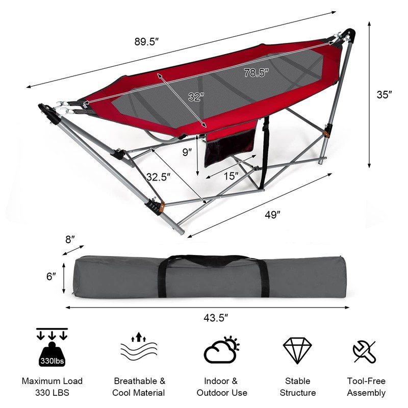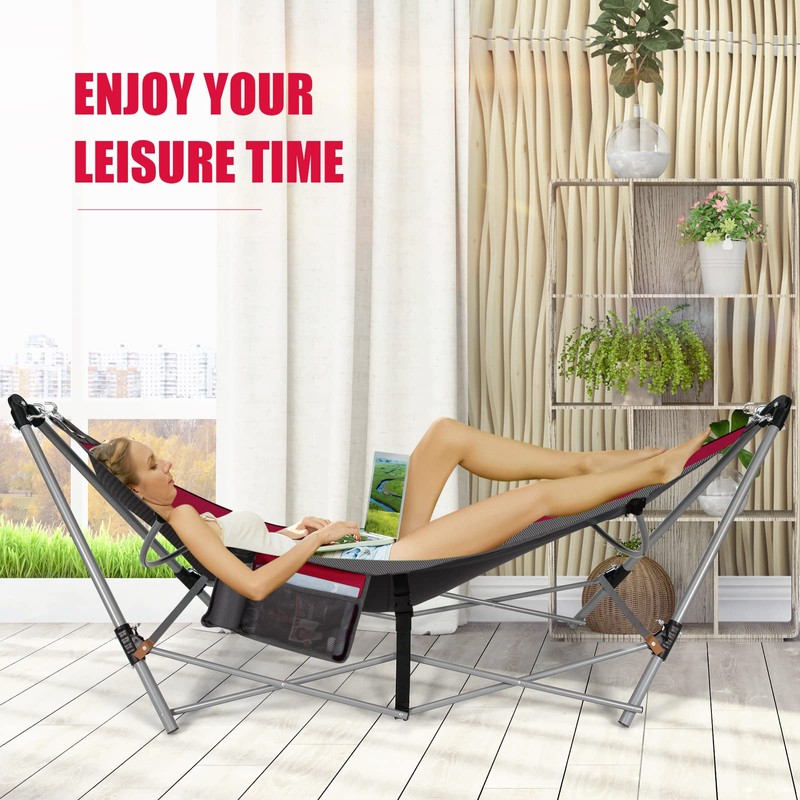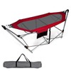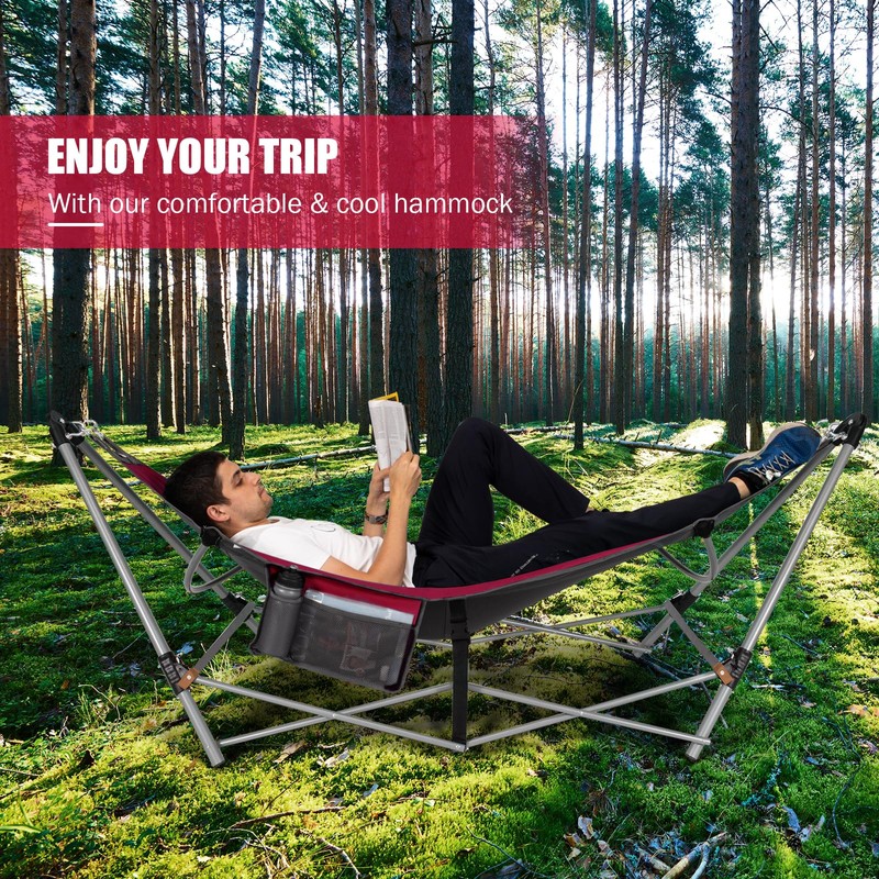 GLOBALWAY Portable Folding Hammock w/Side Pocket, Lounge Camping Bed w/Metal Stand & Anti-tip Buckles, Outdoor Camping Hammock with Carrying Bag for Patio Garden Yard, Easy Assembly (Red)