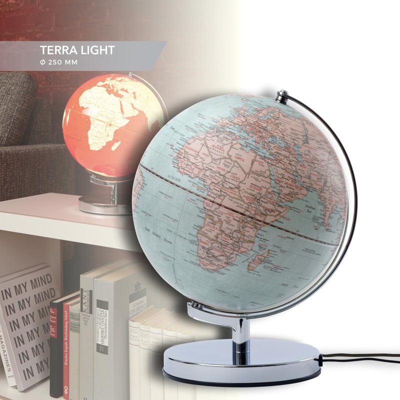 - TROIKA Original globe with 25 cm diameter. Illuminated globe with a total height of 32 cm, rotatable on a sturdy chrome-plated metal base. Other features: black cable with Euro plug and switch. LED globe Terra Light with illuminated map image. The country areas are beige and the seas are light blue. The globe is labeled in English and depicts continents, countries, oceans, geographical zones, major cities and mountains.