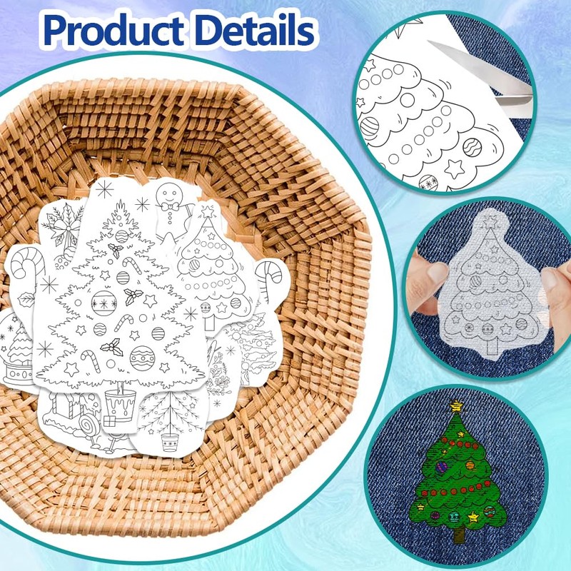 - Package: This set includes 4 sheets of 210x297mm/8.3x11.7-inch water-soluble embroidery stabilizers, 27 pieces of Christmas themed patterns. Designs such as Christmas trees, gifts, cookie makers, bells, etc. are artistic and exquisite in appearance.