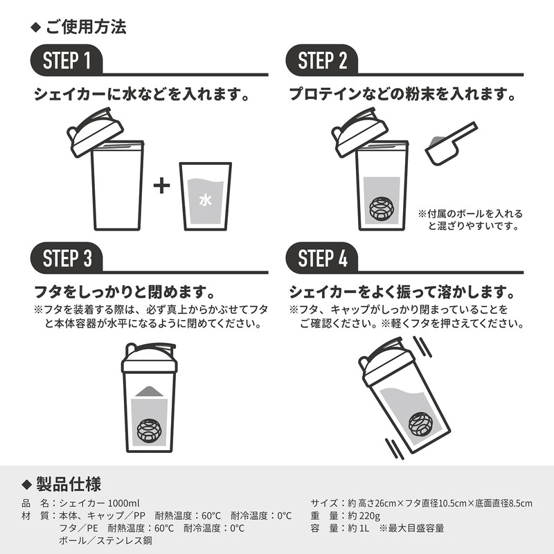 - The "protein shaker 33.8 fl oz (1,000 ml) is large and easy to clean. This shaker can also be used for amino acid drinks with a large amount of water and is recommended for use when training to stay hydrated
