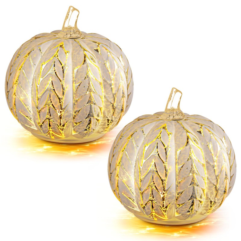 - Two Glass Pumpkin LED Lights: our set includes 2 pcs of decorative glass pumpkin LED lights; Each pumpkin comes with an white finish that brings an antique feel to your setting; Delight in this carefully designed package for an addition to your festive decor