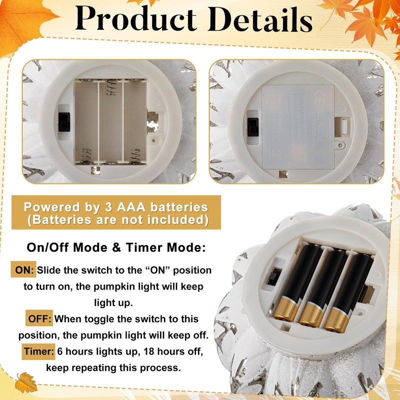 - Timer Mode: featuring an on/off and a 6 hour timer mode, when the 6 hour timer is finished, it will start after 18 hours; These lighted pumpkins cater to your needs effortlessly; You'll not be bothered with turning these lights on and off every night; Convenient and energy saving decorative lighting, please note that include battery is not included