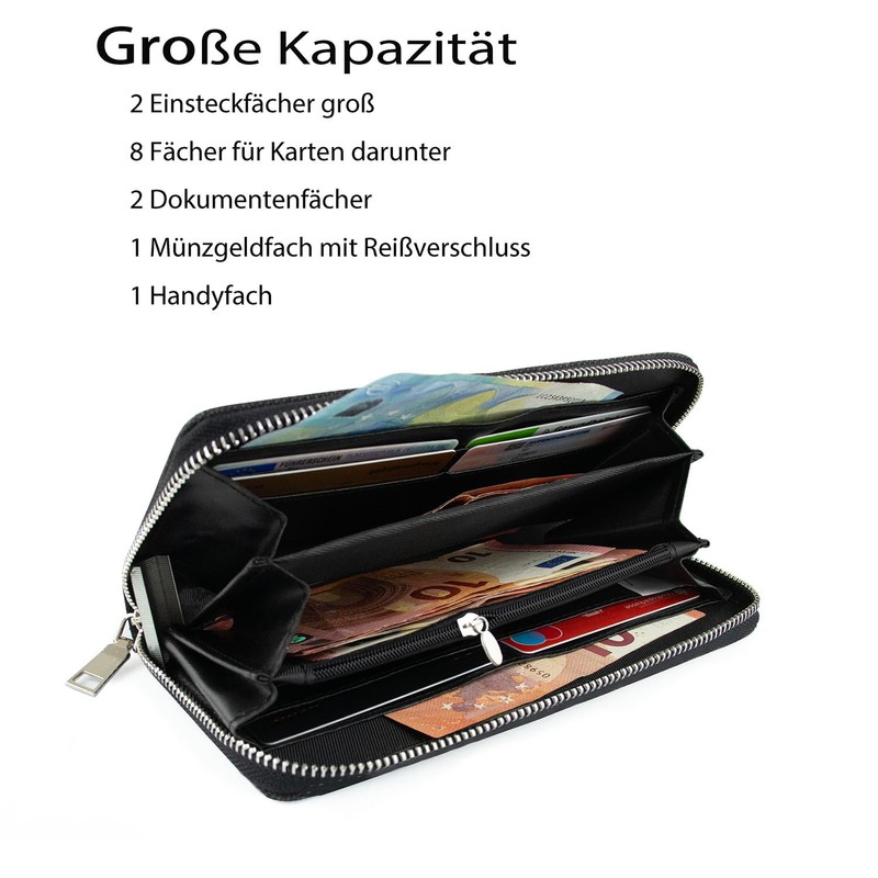 - Versatile compartments for organisation: it has 2 large slip pockets, 8 card slots, 2 document slots, a coin compartment with reliable zip and a separate mobile phone compartment. Keep your cards, documents, coins and mobile phone well organised in one place.