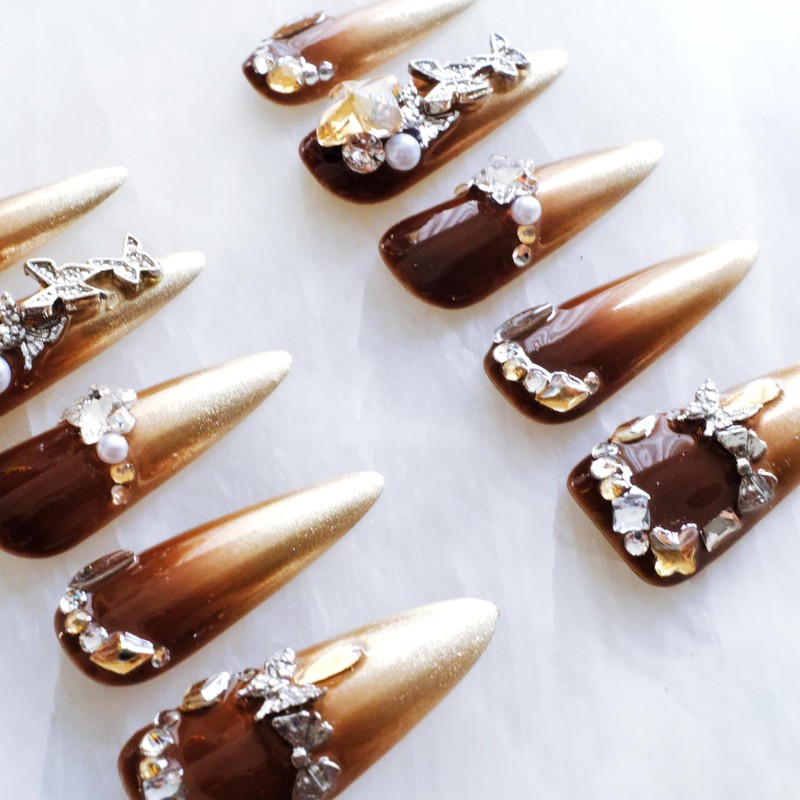 - PREMIUM DESIGN: Handcrafted stiletto-shaped press-on nails featuring an elegant brown to gold ombre gradient with luxurious 3D rhinestone and pearl embellishments