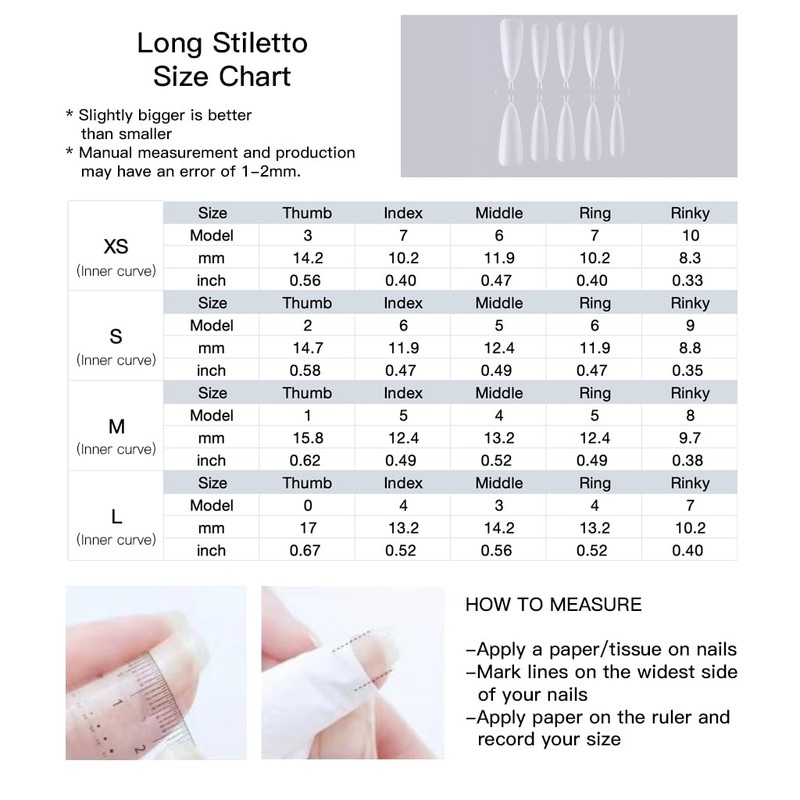 - SET CONTENTS: Complete set of 10 pieces of ready-to-wear false nails in varying sizes to ensure a perfect fit for all finger types. Please note that: Liquid Glue is NOT included, but the tool pack contains at least one sheet Jelly Double Sided Nail Adhesives Tab.