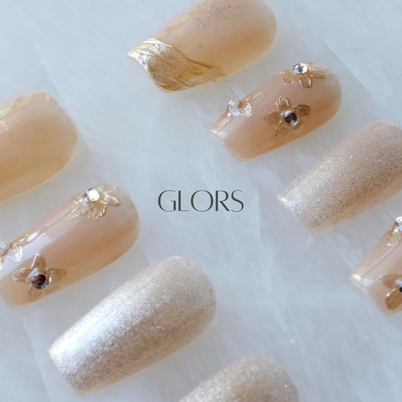 [GLORS] Purly Handmade Medium Ballerina Press on Nails | Nude ombre Cat Eye Fake False Nails with Gold Floral Glitter | Salon Quality Ballerina Nail, 10 pieces (XS, MB)