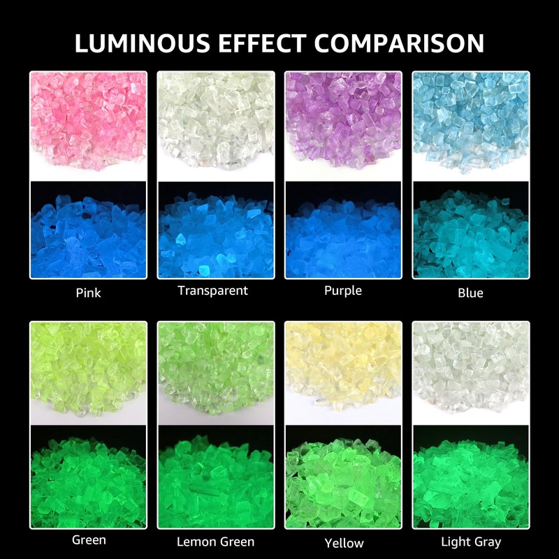 - Pure Glow Glitter:These glass pieces are light yellow in daylight, and after absorbing enough ultraviolet light (sunlight) to store energy, they radiate a green glow in the dark. Please choose the color that you want carefully before purchasing.