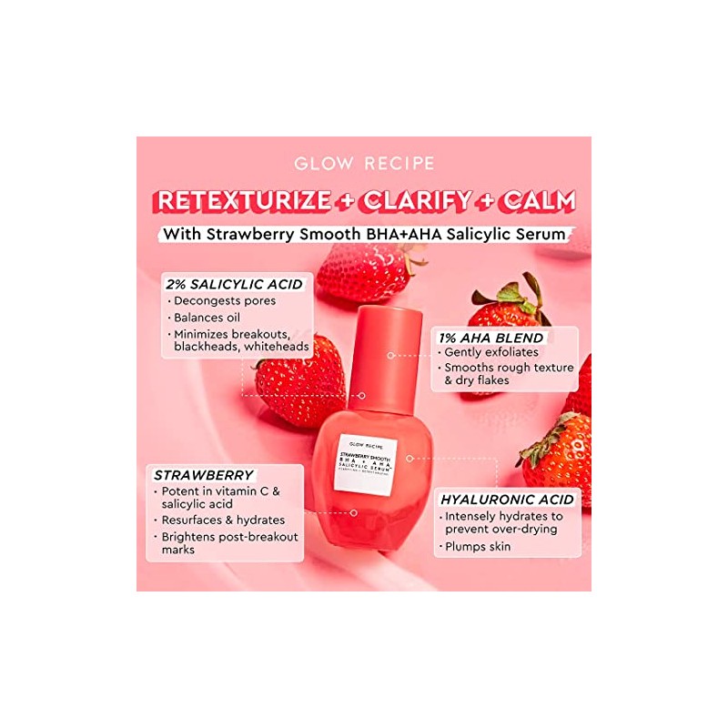 Glow Recipe Strawberry Smooth AHA BHA Salicylic Acid Serum - Daily Hyaluronic Acid Serum with Succinic Acid + Allantoin - Face Clarifying Pore Minimizer + Azelaic Acid for Brightened Complexion (30ml)