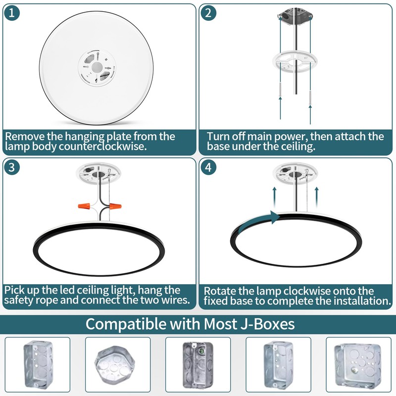 • Easy Installation: Only 3 easy steps to install the flush mount ceiling light. ① Turn off main power, then attach the base under the ceiling. ② Pick up the led ceiling light, and connect the two wires. ③ Rotate the ceiling light to the mounting base. Simple and safe. The installation of the led ceiling lamp can be done in a few minutes. (All accessories needed and instructions are included in the package)