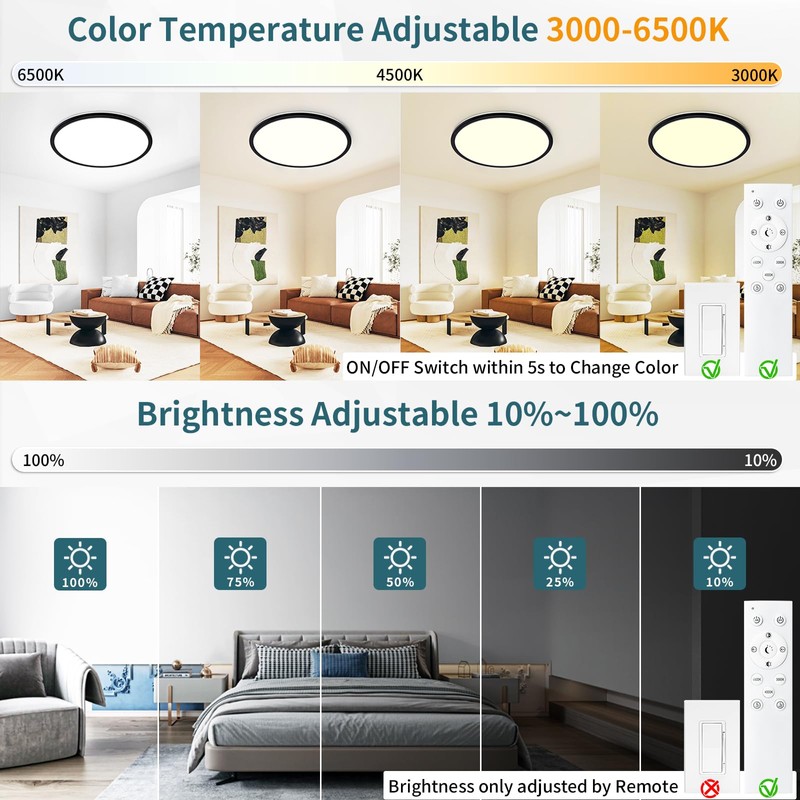 • Color Temperature & Brightness Adjustable: Golowall led ceiling light can be continuously adjusted brightness(10% to 100%) and changed color temperature (3000K~6500K) only by the remote control, and even with a soft night light function (20% brightness). The timer function allows the ceiling light to switch off automatically after 60 seconds before bedtime