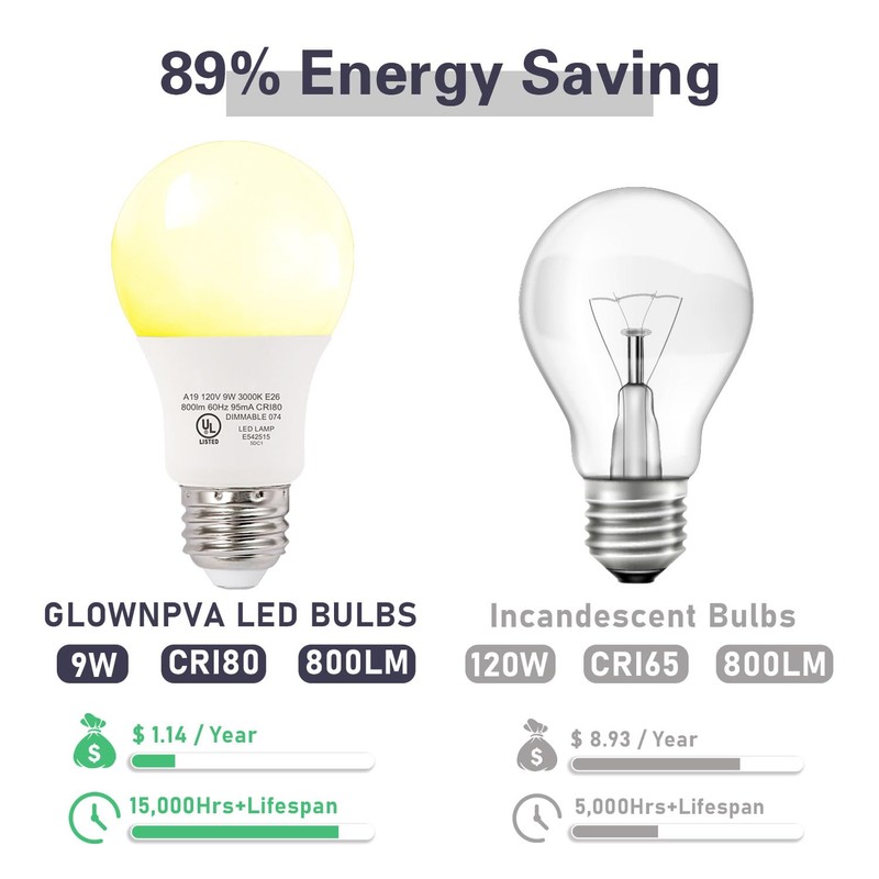 - Energy Efficiency and Cost Savings Our LED light bulbs offer a major enhancement in energy efficiency compared to traditional incandescent bulbs. They use only 9.5W to match the brightness of a 60W incandescent bulb, resulting in an 85% decrease in energy usage and significant savings on utility costs. These bulbs are fully dimmable, allowing you to adjust the brightness from 10% to 100%, enabling you to create the ideal atmosphere for any event.