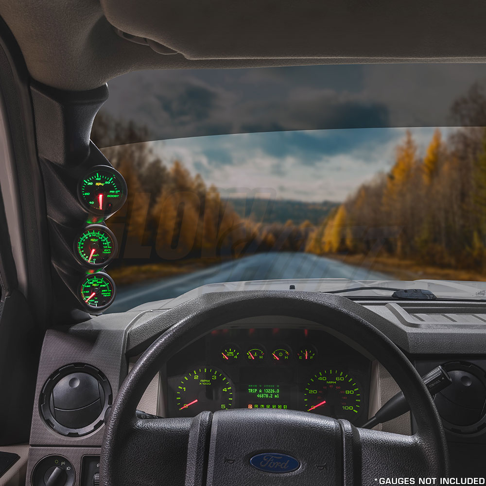 GlowShifts Black Triple Gauge Pillar Pod is custom made for any 2008-2010 Ford Super Duty F-250/F-350 and mounts directly to the factory A-pillar, holding (3) 2-1/16" (52mm) gauges. This aftermarket gauge pod for the 6.4L Power Stroke is manufactured from high quality ABS plastic, allowing it to withstand cracking, fading and warping. It can also be painted using ABS plastic paint to match your factory interior for a custom fit and finish. Each triple pillar pod is installed using the included color matched ABS plastic push-in mounting fasteners, ensuring that your gauge pod is secure.
