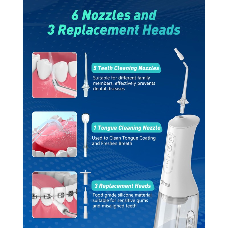 - 6 Düsen und 3 Ersatzköpfe in Lebensmittelqualität:Der zahndusche verfügt über 5 standarddüsen und 1 zungenreinigungsdüse,sodass jedes familienmitglied seine eigene düse haben kann.Glracd irrigator zähne ist außerdem mit 3 ersatzköpfen aus lebensmittelechtem silikon ausgestattet,die nicht nur speisereste zwischen den zähnen effektiv entfernen,sondern auch zahnstein und mundgeruch wirksam vorbeugen können.Diese sind auch besonders für personen geeignet,die eine klammer oder einen retainer tragen