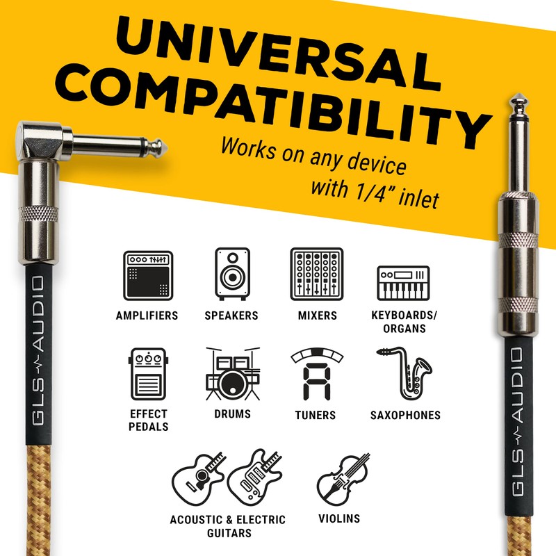 GLS Audio Instrument Cable - Amp Cord for Bass & Electric Guitar - Straight to Right Angle 1/4 Inch Instrument Cable - Brown/Yellow Braided Tweed, 20ft