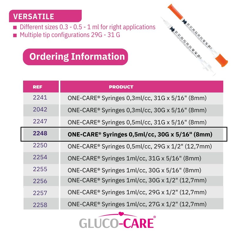 - 0.5ml/cc x 30G 5/16" (8mm)