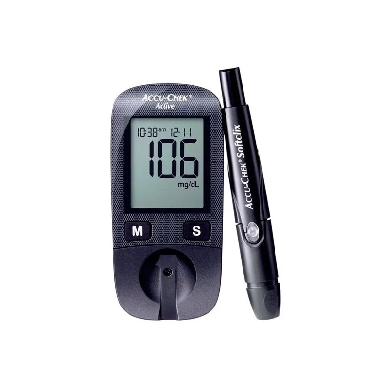 Incluye: 1 Glucómetro, 10 tiras reactivas Active, 10 lancetas Softclix y 1 puncionador Softclix de punción indolora