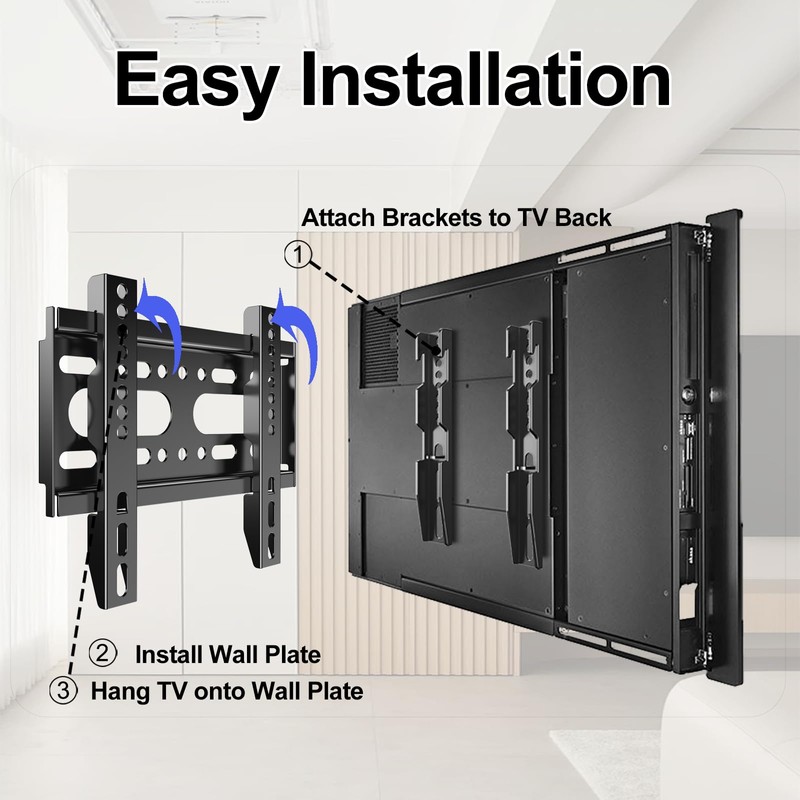 - 【Strong&Sturdy Design】 We are confident in the strength and durability of our universal TV bracket. They are made of premium steel material. The security locking screws of our television mount, fixed on the wall plate, avoiding sliding or falling. Whether you are mounting in the living room, bedroom, or children’s room, you can enjoy peace of mind knowing that your TV is secure.