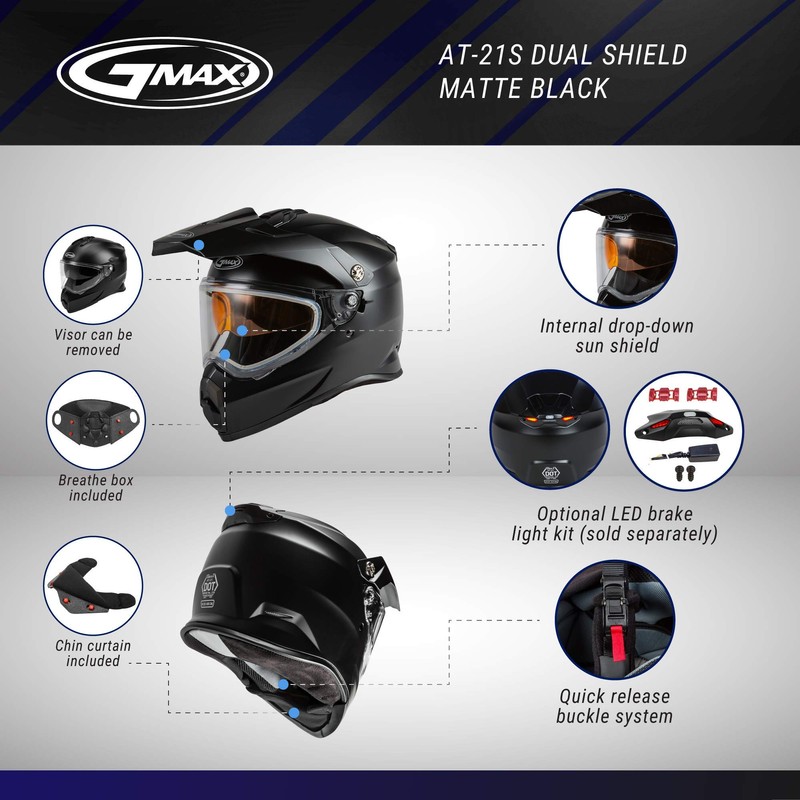 - DUAL SPORT HELMET: This dual sport helmet offers full coverage of the head and face without the weight of traditional dual sport helmets. Made to fit all kinds of goggles, this dual sport helmet features a large eye port and easy visor configuration.