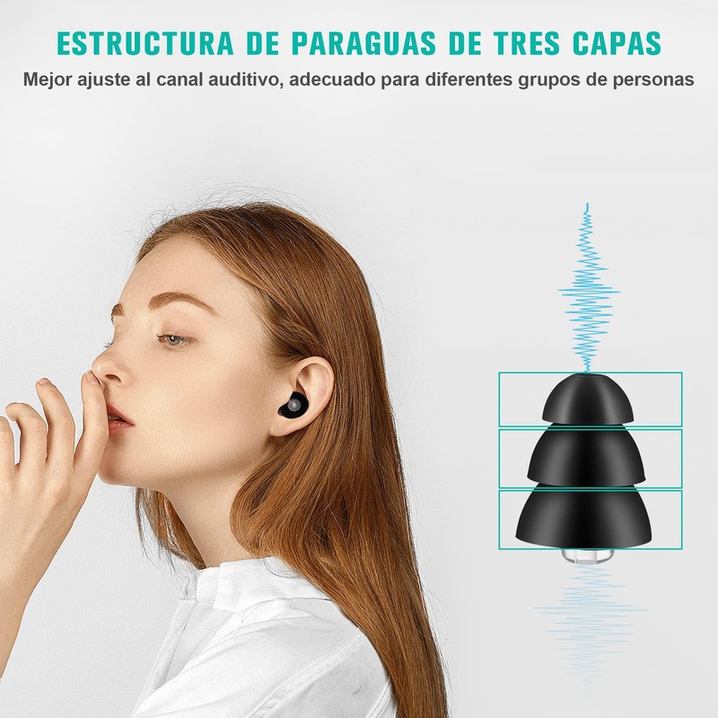 - Estructura De Paraguas De Tres Capas: Los tapones para los oídos adoptan una estructura de paraguas de tres capas, que puede atenuar el impacto de las ondas sonoras en el tímpano tres veces, se adapta mejor al canal auditivo y es adecuado para personas con diferentes tamaños de canales auditivos