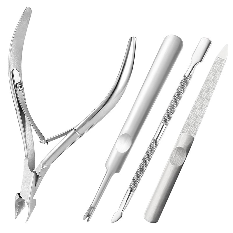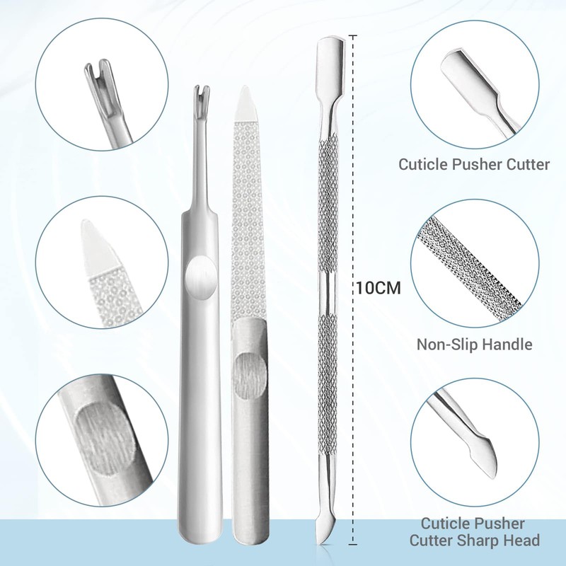 - Box contents: you will receive 1 cuticle nipper, 1 cuticle pusher, 1 cuticle cutter, 1 nail file. You can trim long nails or remove excess dead skin at any time without having to buy separate tools. This meets your various manicure and pedicure needs.