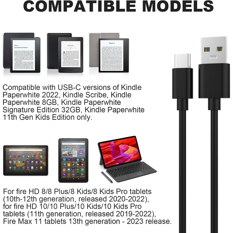 - COMPATIBLE: USB Type C cable only compatible with USB-C Version Kindle Paperwhite 2022, Kindle Scribe, Kindle Paperwhite 8gb, Kindle Paperwhite Signature Edition 32gb, Kids Kindle Paperwhite 11th Generation. For fire HD 8/8 Plus/8 Kids/8 Kids Pro tablet (10-12th Gen, 2020-2022 Release), for fire HD 10/10 Plus/10 Kids/10 Kids Pro tablet (11th Gen, 2019-2022 Release), Fire Max 11 tablet 13th generation - 2023 release. Please check if your device is the above model and the charging port is Type C before purchasing to avoid purchasing error affecting your usage.