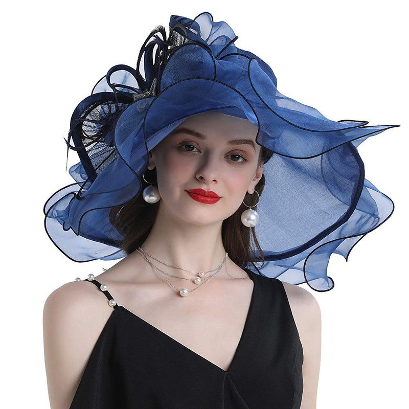 Go Mai - Sombreros de organza para mujer, diseño de mariposa, con ala ancha, para ocasiones y eventos, para el sol, para la iglesia de Kentucky, Marino, 56-58cm