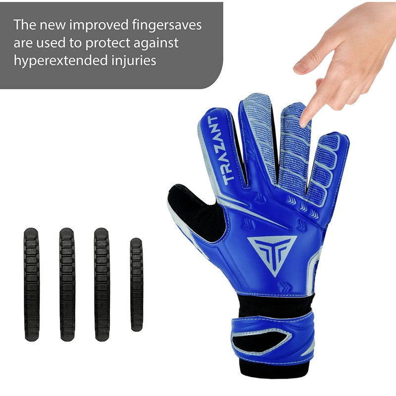 - ⚽ Our gloves have Fingersaves which are used to protect against Hyper-Extended finger injuries. Fingersaves give the keeper confidence, by giving extra support and protection. They are comfortable in wearing and don't impede movement.