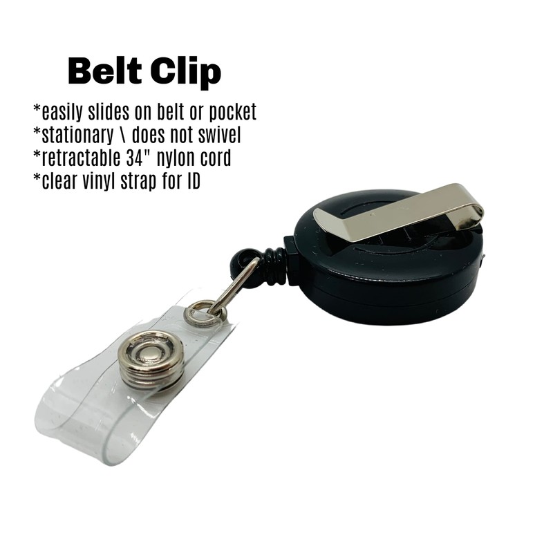 Belt Clip- Easily slides onto your belt or pocket for quick and convenient access to your badges at any time. Retractable 34" nylon cord. Clear strap for your ID. Stationary clip that does not rotate.