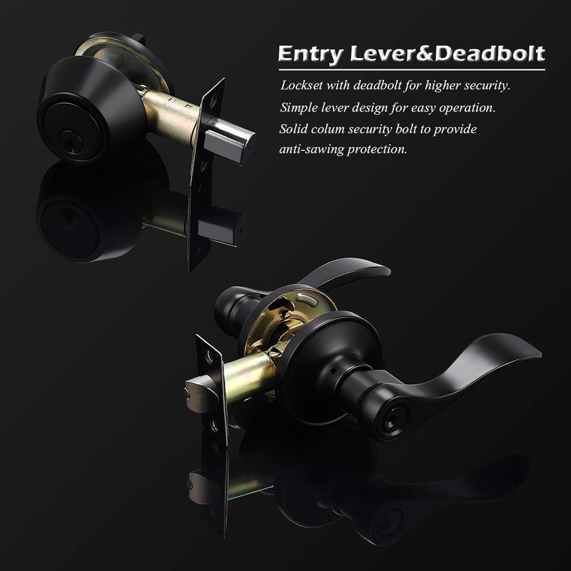 Gobrico 2 Pack Exterior Door Lever Lockset with Single Cylinder Deadbolt Black Door Handle with Deadbolt Lock Set Keyed Alike, Matte Black Finished