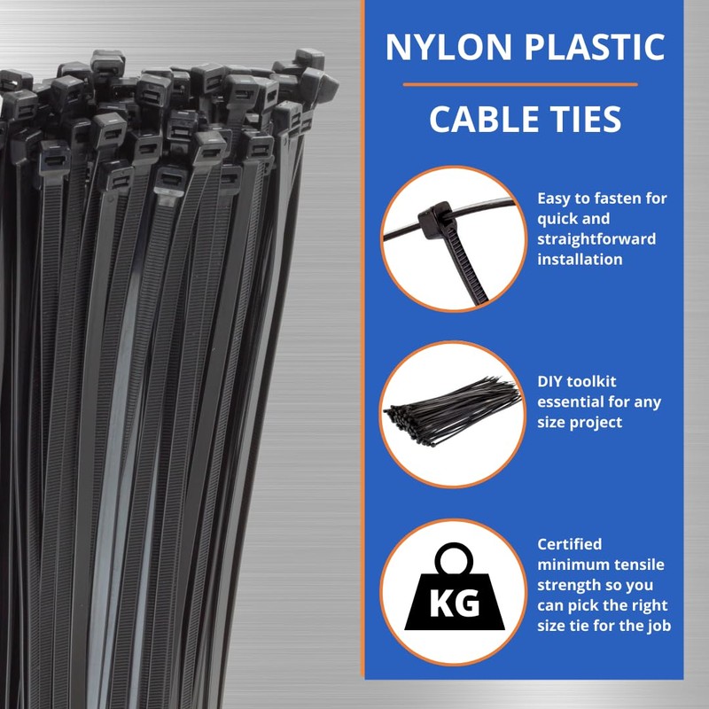- PACK OF 100 MULTI PURPOSE NYLON CABLE TIES: 300mm x 3.6mm black plastic cable ties. Made from durable and UV-resistant nylon polyamide 6/6 for a long-lasting solution for DIY or professional use. Wide range of colours, lengths, and widths available to find the perfect product for the job.