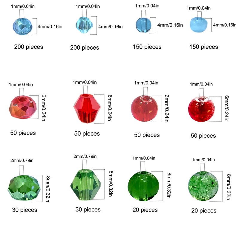 - [1000-Piece Glass Bead Bundle] Includes 4 styles: faceted (280pcs), bicone (280pcs), crackled (220pcs), smooth (220pcs) in 3 sizes (4mm=blue, 6mm=red, 8mm=green). Perfect for layered jewelry, holiday décor, or bulk crafting