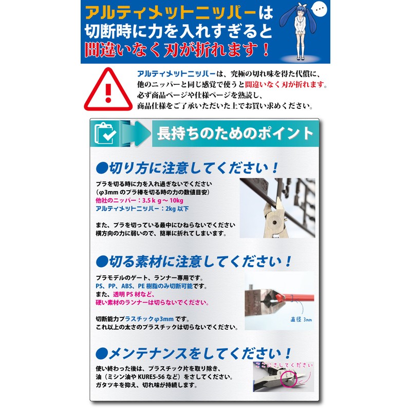 - ''' These ultimate nippers are especially for plastic models (Right handed).#||# Comes with an original nipper cap.#||# Cutting Capacity: Plastic Diameter under 3mm. Please refrain from cutting above cutting capacity.#||# Please refrain from cutting hard runners.'''