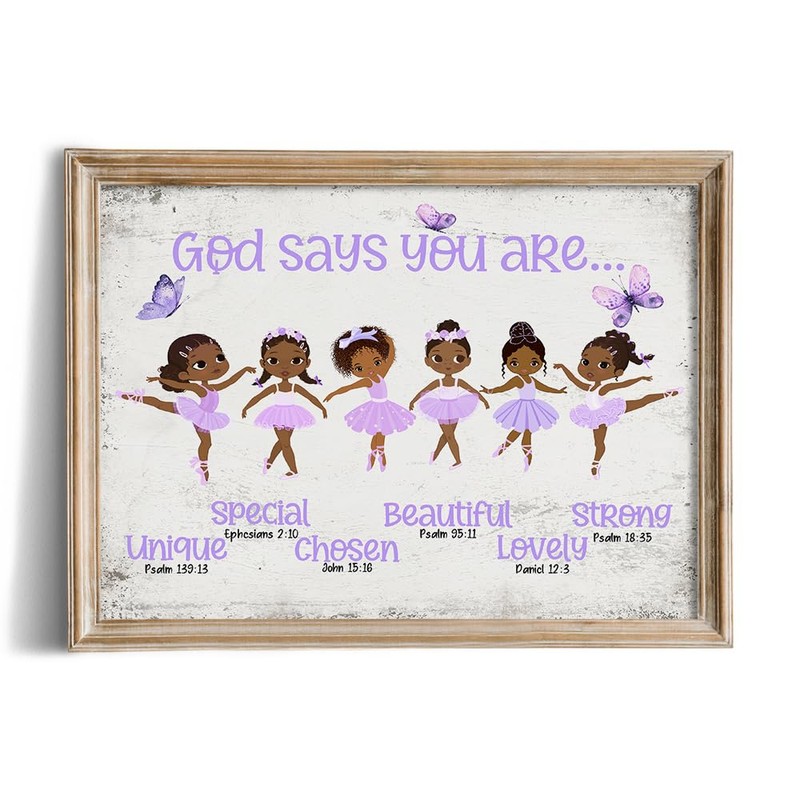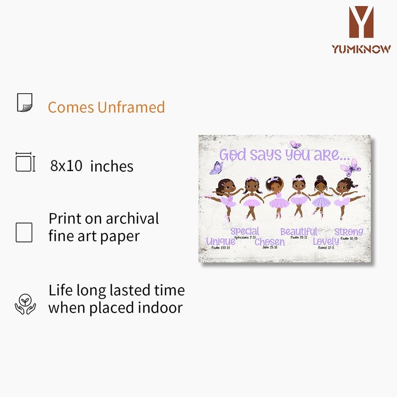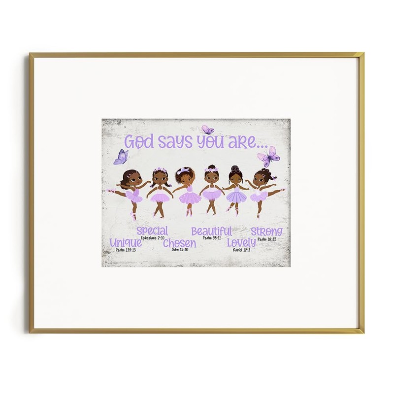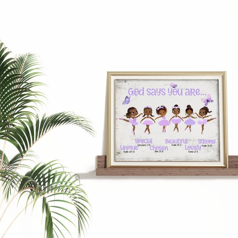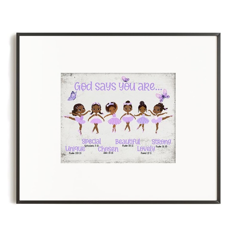God Says You Are Christian Bible Verses - Rustic Purple Ballerina Baby Girl Room Decor - Black Afro African American Girl Wall Art - Religious Room Decor for Toddler Nursery Bedroom Decor - 8x10 Print