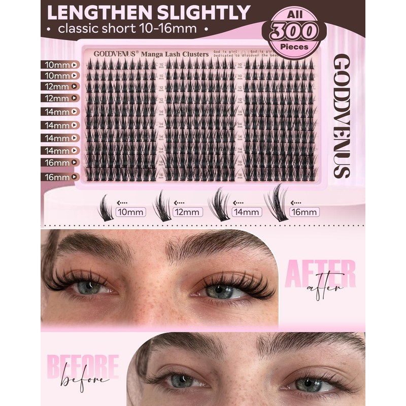 Goddvenus Manga Lash Clusters Kit 300 Pcs Wispy Eyelash Clusters 10-16mm Fluffy Cluster Eyelash Extensions Kit Anime Cosplay No Plastic Feel Individual Lash Extension CC Curve