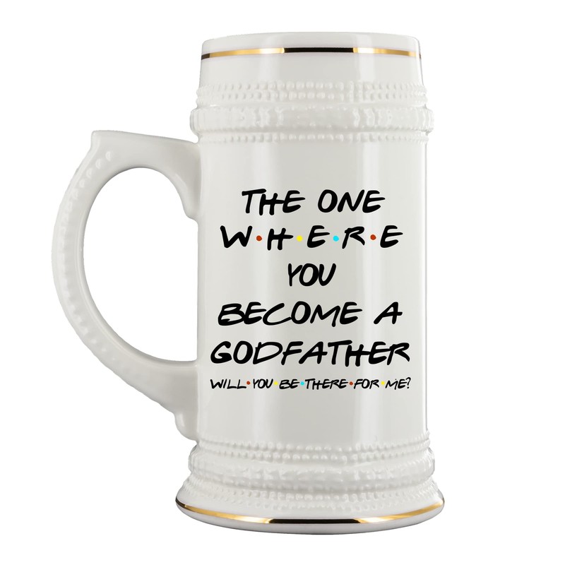 Godfather Proposal Beer Mug for Friend Brother The One Where You Become acGod Father Will You Be There For Me Friends TV Show Inpsired Baptism Christening Invite 22 Oz. Ceramic Stein for Men