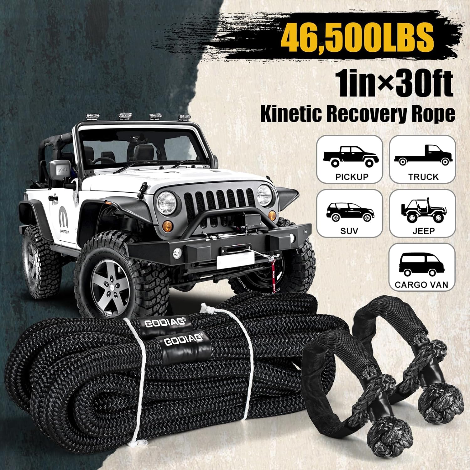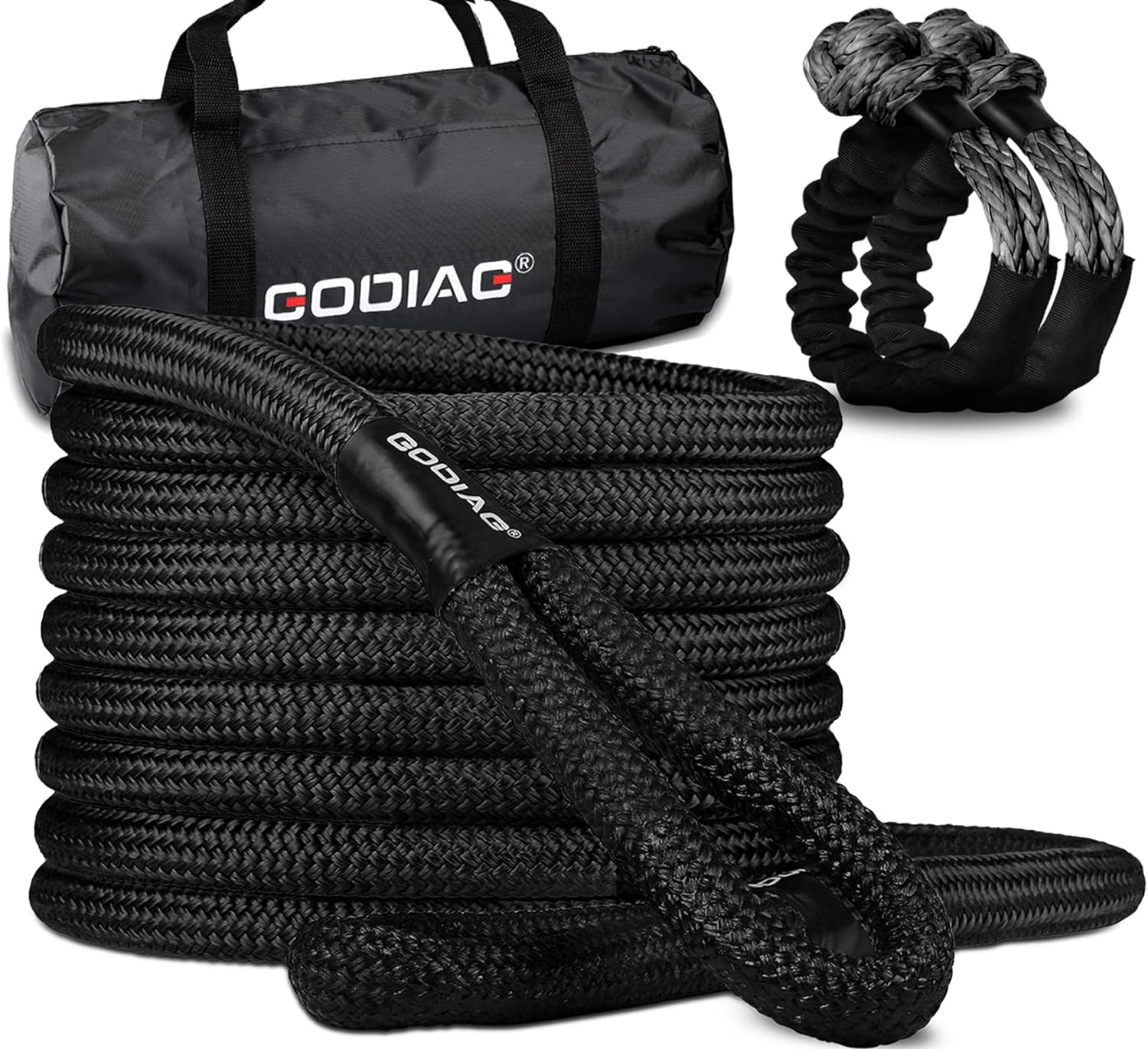 GODIAG 1"×30ft Kinetic Recovery Tow Rope With 2 Soft Shackles Offroad Recovery Kit