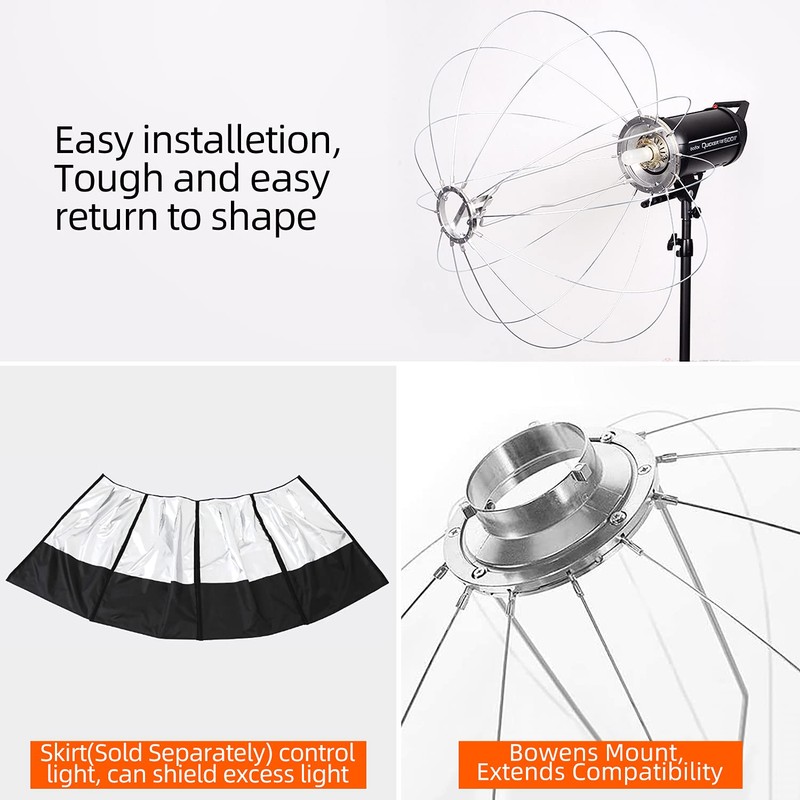 • Optional skirt to achieve light control: Rolling up or down the skirt(not included), you can get off any unwanted bouncing light. With it, you are able to get soft even lighting effect with high efficiency. Precisely control your soft light.