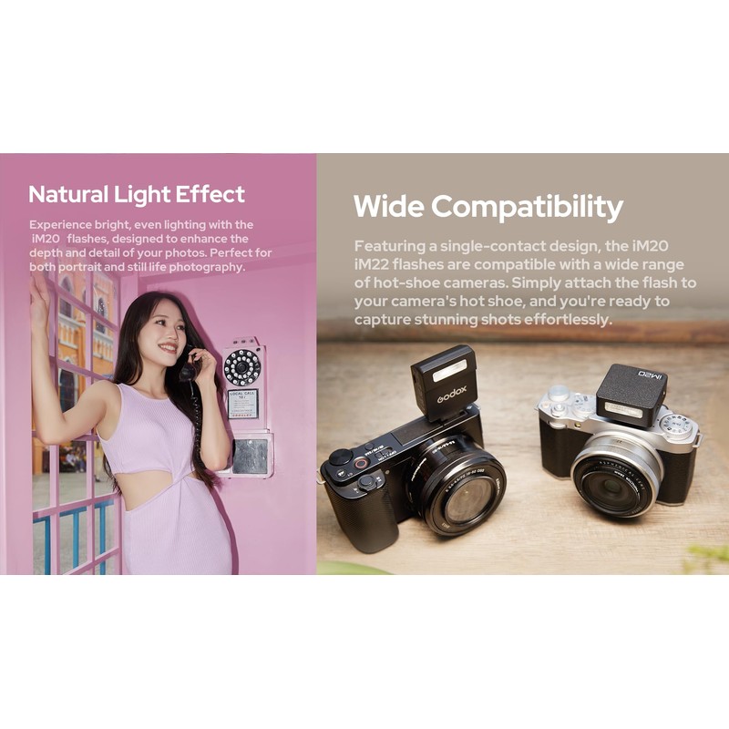 - Lightweight Portability: The GODOX IM20 mini camera flash for Sony/Canon/Fuji/Ricoh is a compact and lightweight flash, weighing a mere 31 grams, the iM20 flash is a marvelof lightweight design. lts compact form seamlessly integrates with your camera, making it the perfect companion from everyday street photography to travel documentation. It works exceptionally well with pancake lenses or other compact lenses.