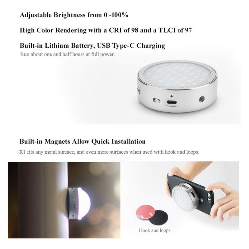 Godox R1 RGB luz de vídeo LED, recargable a todo color, mini luz LED redonda, 2500 K - 8500 K con CRI 98, función de luz de ritmo musical y 14 efectos de iluminación FX, carcasa de aleación de aluminio y instalación rápida magnética