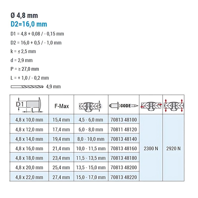 - ☛ ☑ Size: Diameter (mm): 4.8 ★ Length (mm): 10 ★ Length of rivet pin (P): ≥ 27.0 mm ★ F-Max (mm): 15.4 ★ Diameter head (D2): 16.0 + 0.5 / - 1.0 mm ★ Head height (k): ≤ 2.5 mm ★ Ni. etdorn dorn diameter (d) (mm): 2.9