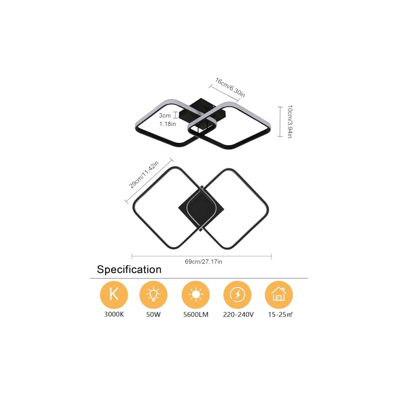 - Specifications - Ceiling light size: 69 CM * 37 CM * 10 CM, Weight: 1KG, Power: 50W, Effective Luminous Flux: 5600LM, Voltage: 220V-240V, Energy Efficiency Class: E, Light source is not detachable