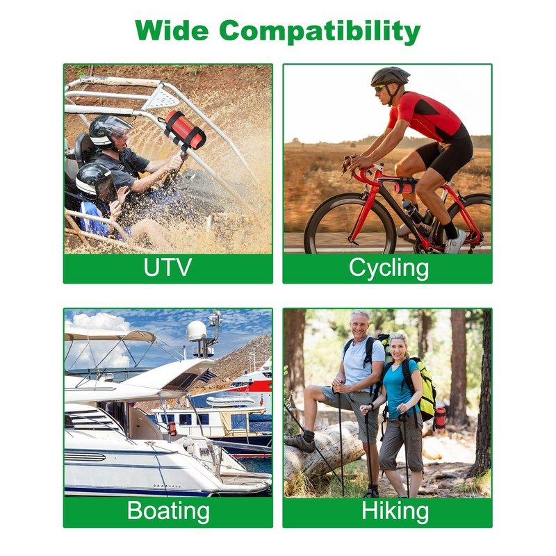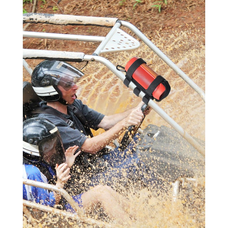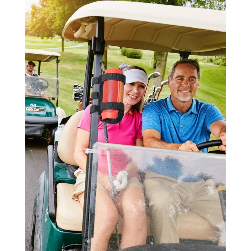 - 【Securely Mounted】3 non-slip adjustable straps firmly attach the Bluetooth speaker to 5"-7" circumference rail, such as golf cart, bicycle, boat, UTV, stroller, cart, beach umbrellas, electric scooters, etc. No worry about the speaker or bottle moving around or falling down on tough terrain.