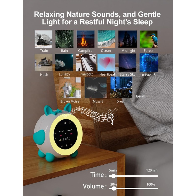 - Sound Machine with 15 Sounds: The alarm clock has 15 built-in soothing sounds, including white noise, nature sounds, lullabies, and more. You can choose the sound you want to listen to before going to bed or when waking up.